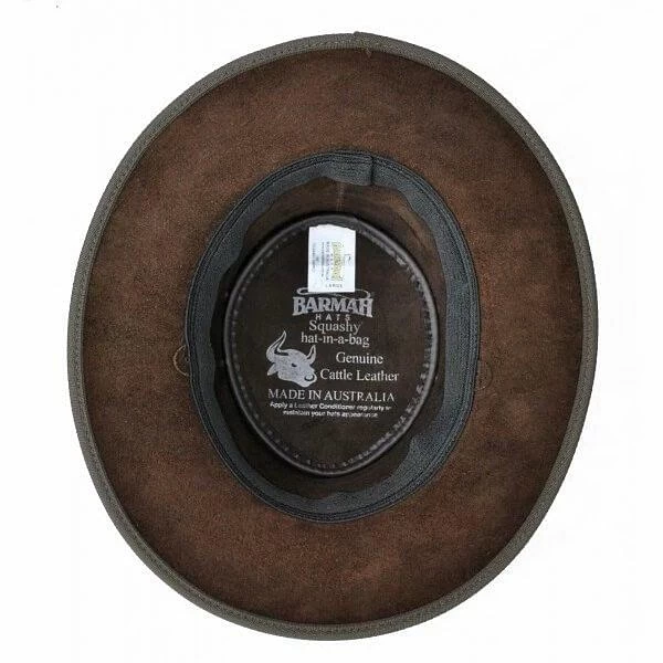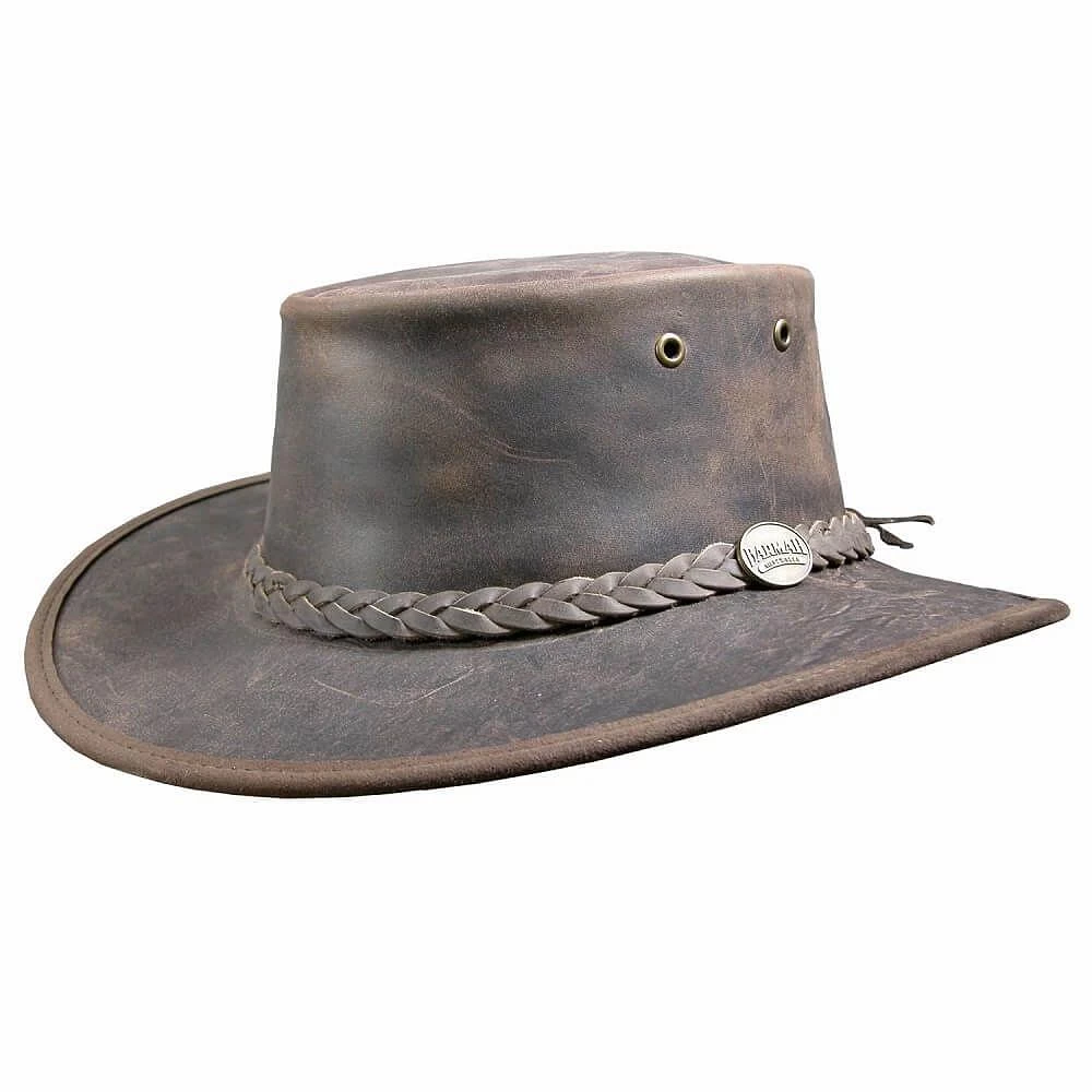 The Barmah Leather Hat in Bronco Brown is a luxurious quality water resistant hat crafted in Australia from premium full grain dark brown cattle hide leather. This super lightweight and durable hat is foldable and features beautiful plaited leather detailing around the base and simple branding along the side. Complete with Barmah calico carry bag. Available in Bronco Brown.