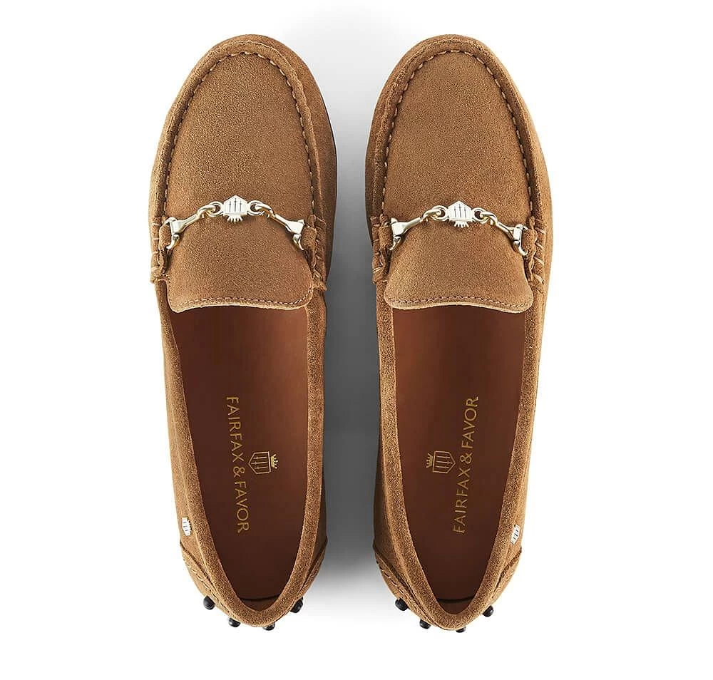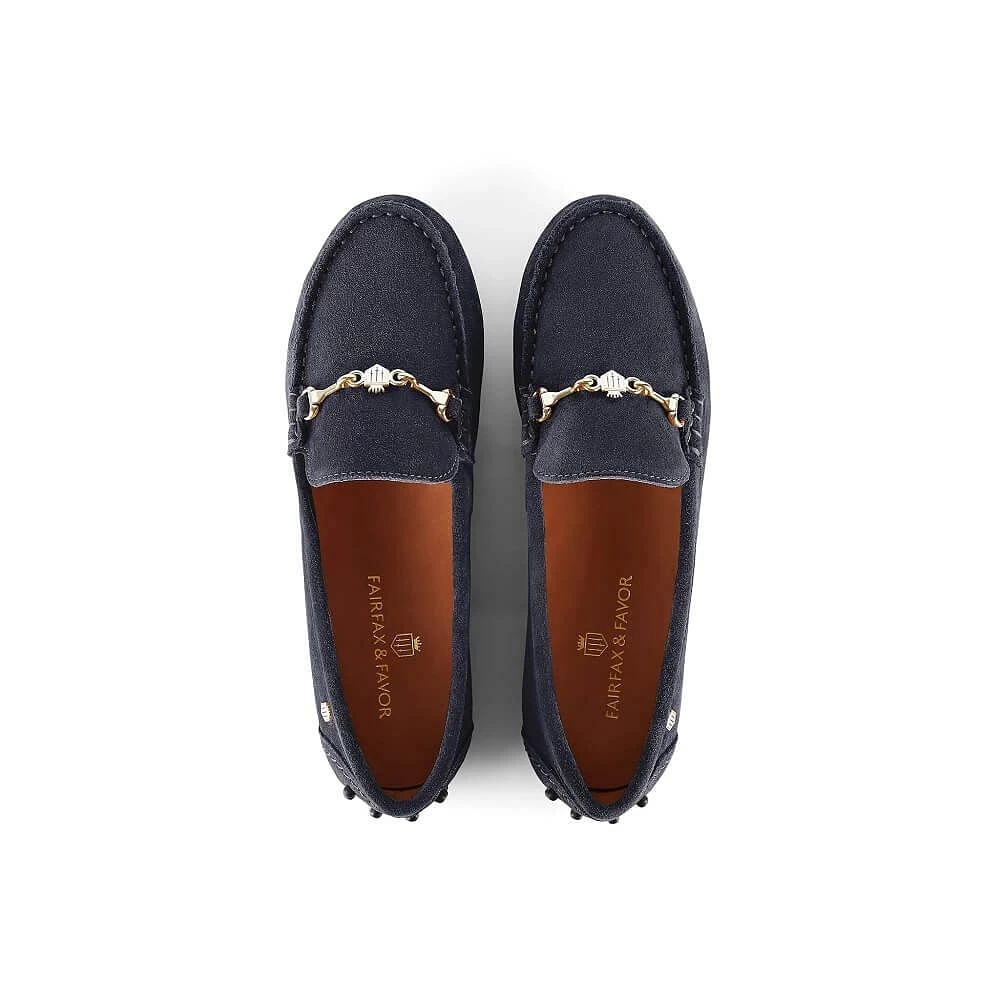 The Fairfax & Favor Ladies Trinity Suede Loafer is the latest addition to the Fairfax and Favor Driving Shoe collection. The Trinity is a stylish take on the much-loved classic driver shoe and has been crafted from a soft luxurious suede and lined with a leather comfort padded insole. The Trinity is guaranteed to upgrade your footwear, and will look exceptionally smart with a pair of skinny jeans, chinos or a summer dress. Finished off with branded gold bit hardware and the signature Fairfax and Favor gold shield. Available in a range of Fairfax’s classic and seasonal colours.