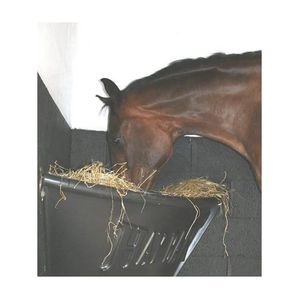 The Haybar Classic Pony Feeder Black is a strong and durable feeder designed to encourage feeding ponies from the floor to improve digestion. The Hay Bar Feeder is manufactured from a high density Polyethylene with a reinforced top edge, a must-have easy-clean alternative to haynets/racks.