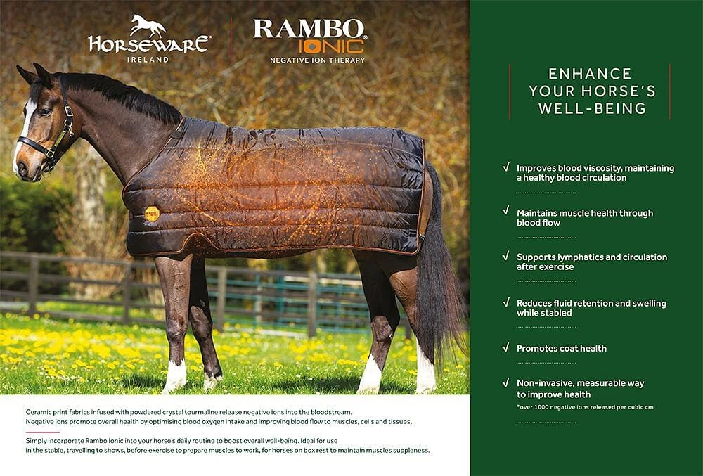 The Horseware Rambo Ionic Stable Rug is a thermobonded 200g fibrefill stable rug that is part of Horseware’s Rambo Ionic family. The Horseware Rambo Ionic Stable Rug gives your Horse all of the benefits of the Rambo Ionic technology in a cosy stable rug. Lined with printed 210T polyester, the Horseware Rambo Ionic Stable Rug has Ionic technology printed on its reverse side for optimum performance.