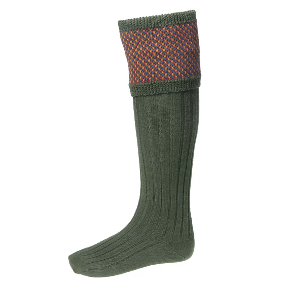 The House of Cheviot Mens Tayside Country Socks are a pair of Merino Wool blend shooting socks. With a vibrant and colourful pattern around the cuff. These socks are sure to make a statement.