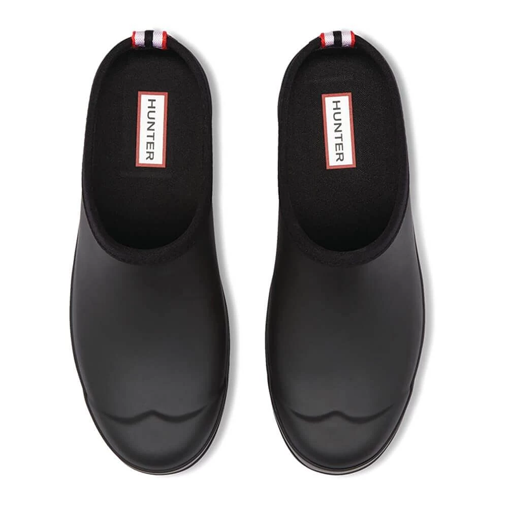 The Hunter Womens Play Clog are a pair of slip-on Clogs made from the highest quality natural rubber and set on a flat platformed sole with an updated 100% recycled polyester lining and insole. The 100% waterproof Clog is engineered with over 160-years of Hunter’s all-weather intelligence. This black matte-finished welly clog features a streamlined silhouette and an adaptability that lends itself to being worn indoors for occupational uses such as nursing and in the kitchen, or outside for the warmer months of the year.