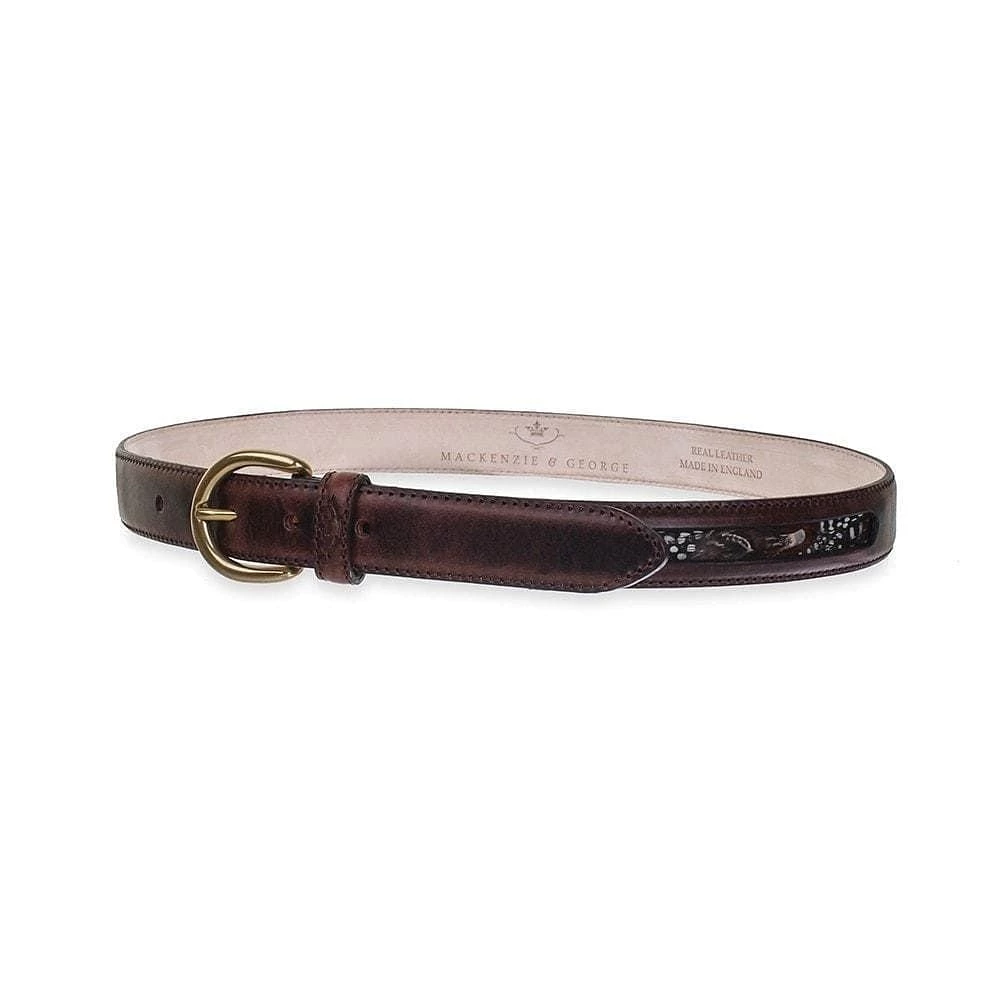 The Mackenzie & George Drayton Feather Belt is a two panelled belt that features real guinea fowl and pheasant feathers. The handmade Drayton Feather Belt feathers are protected to ensure they remain long-lasting and beautiful. The half matt and stitched edges provide the perfect finishing touch to any smart country look. Available in Chocolate.