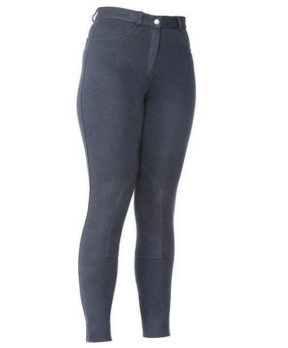 The Shires Ladies Wessex Jodhpurs in Navy are flattering jeans style jodhpurs and made from great fitting Creora® fabric. Self-fabric contour seat and knee patches, four pockets, rear embroidery detail, zip fly and belt loops.