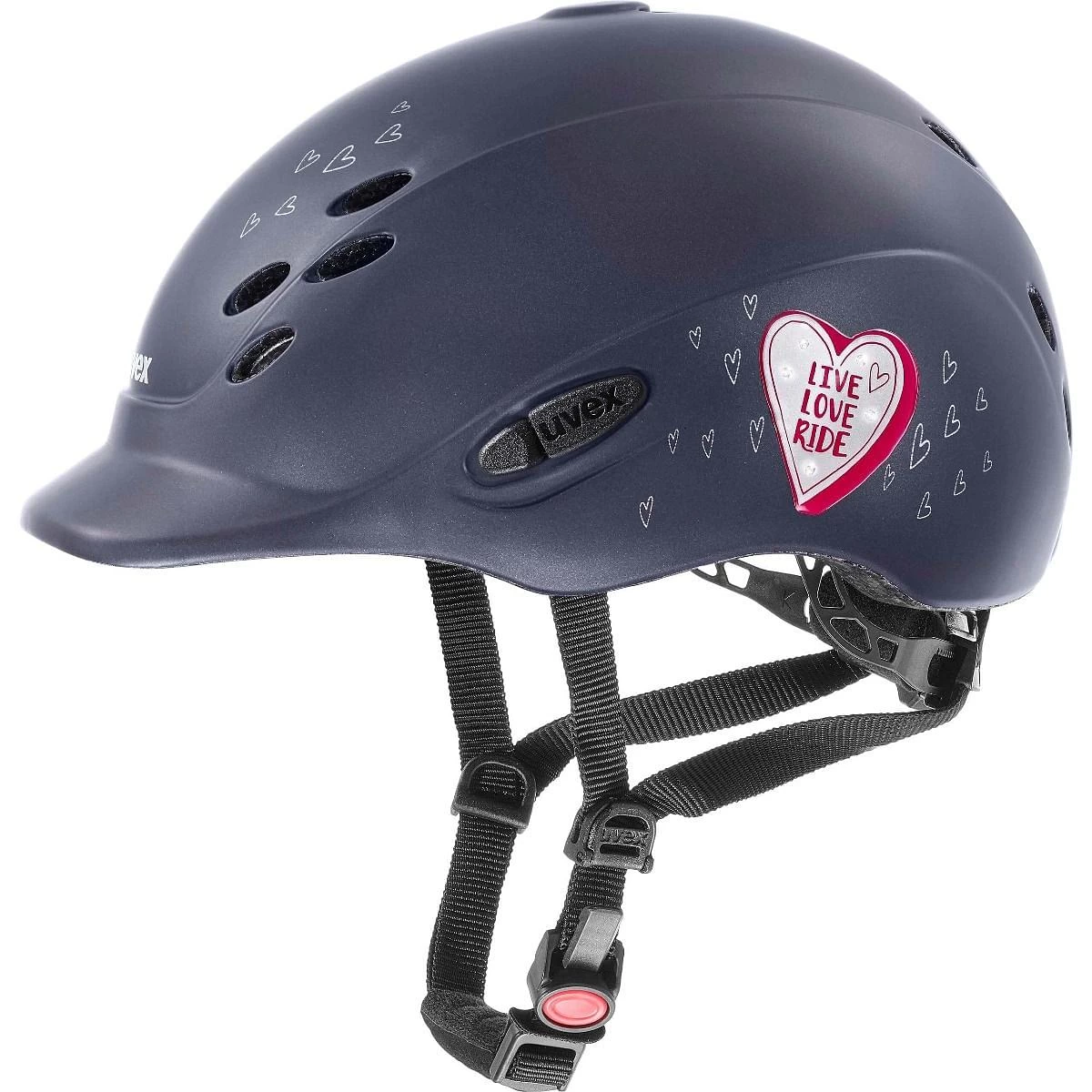 The Uvex Onyxx Glamour Riding Helmet is a touch of glamour for the younger rider! This smart riding hat is designed for children of all ages. The Uvex Onyxx Glamour Helmet is embellished with a heart on the side and sparkling rhinestones, providing subtle bling for the keen equestrian. Coupled with its lightweight feel and safe inmould, this riding hat ticks all the right boxes.